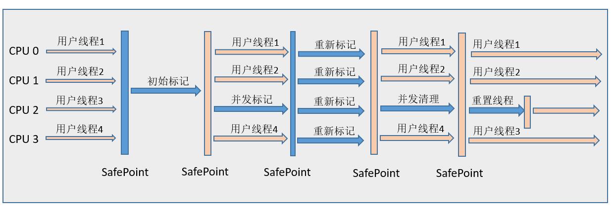 初始标记阶段仅仅只是标记一下 GC Roots 能够直接关联的对象,并且修改 TAMS(Next Top at Mark Start)的值,让下一阶段的用户程序并发运行的时候,能在正确可用的 Region 中创建新对象,这个阶段需要暂停线程。并发标记阶段从 GC Roots 进行可达性分析,找出存活的对象,与用户线程并发执行。最终标记阶段则是修正在并发标记阶段因为用户程序的并发执行而导致标记产生变动的那一部分记录,这部分记录被保存在 Remembered Set Logs 中,最终标记阶段再把 Logs 中的记录合并到 Remembered Set 中,这个阶段是并行执行的,需要暂停用户线程。最后在筛选阶段首先对各个 Region 的回收价值和成本进行排序,根据用户所期望的 GC 停顿时间制定回收计划。