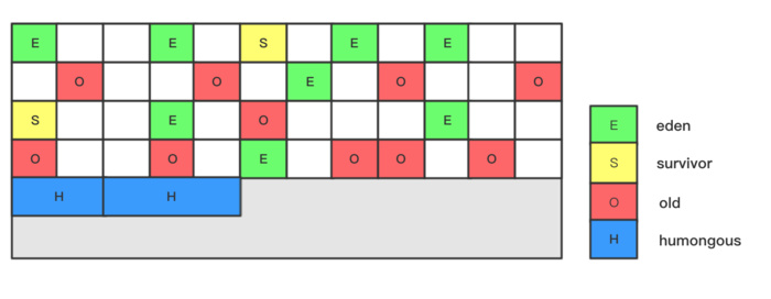 G1 收集器将整个 Java 堆划分为多个大小相等的独立区域(Region),并跟踪各个 Region 里面的垃圾堆积的价值大小,在后台维护一个优先列表,每次根据允许的时间,优先回收价值最大的 Region。每个 Region 是逻辑上连续的一段内存。结构如下: