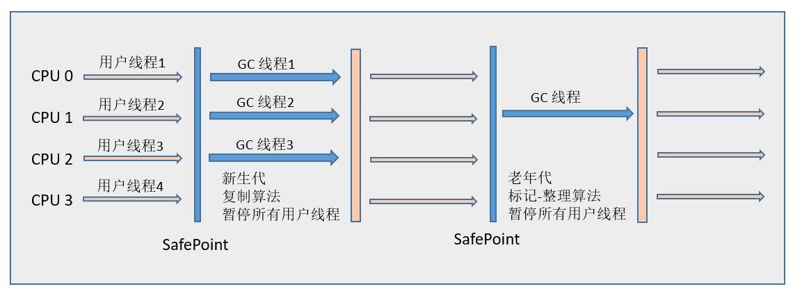在注重吞吐量 CPU 资源敏感的场合,可以优先考虑 Parallel Scavenge 加 Parallel Old 收集器,工作过程如下: