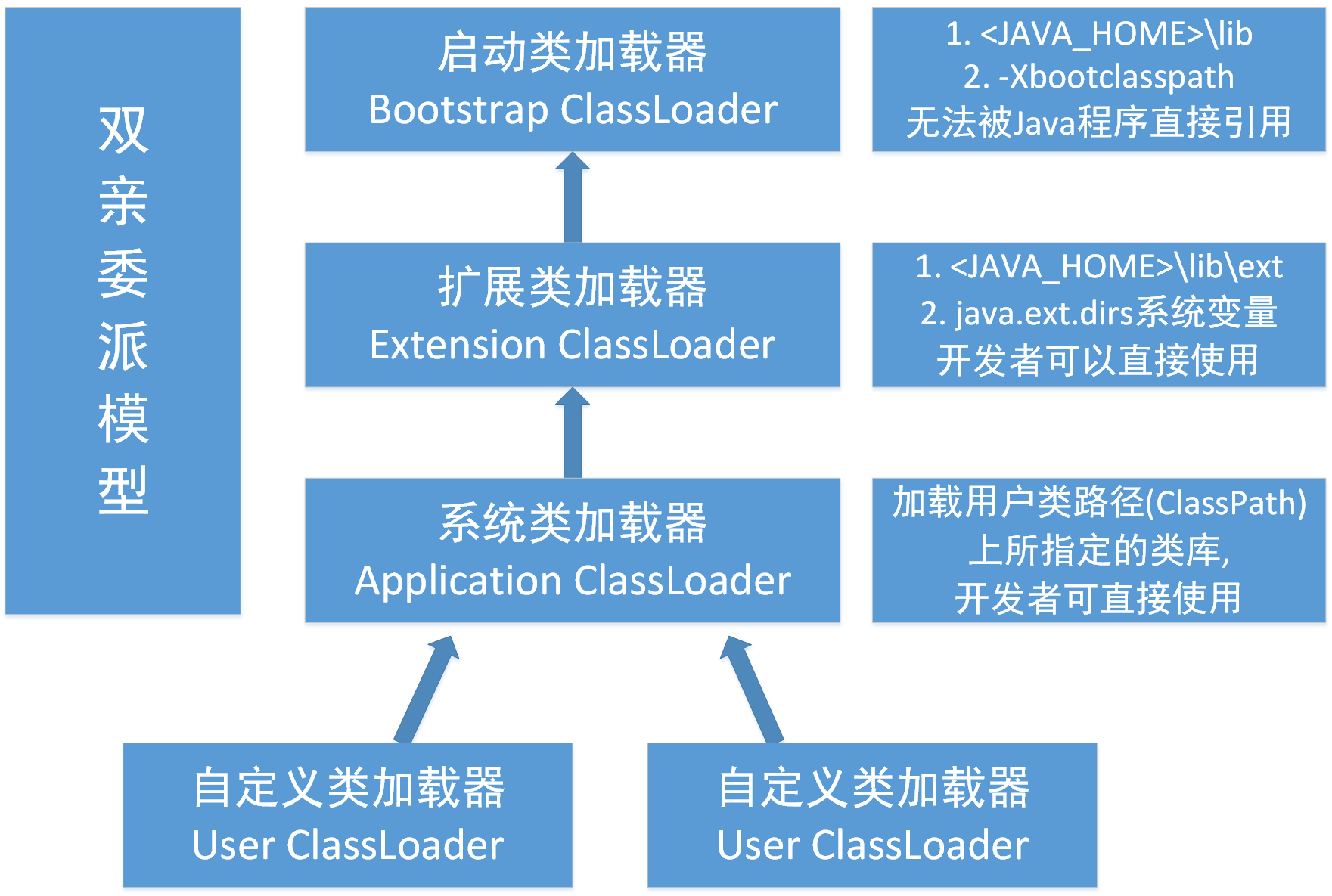 图中展示的类加载器之间的层次关系,称为类加载器的双亲委派模型,该模型要求除了启动类加载器外,其余的类加载器都应当有自己的父类加载器。类加载器的父子关系都是使用组合关系来复用父加载器的