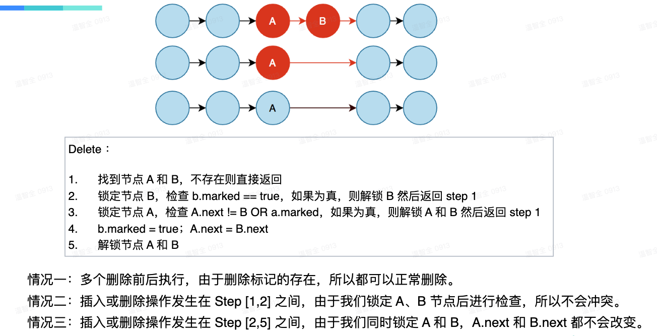 第二步的时候还需要检查 A.marked 是否为 true,如果是的话说明 A 已经被别的节点删除了,此时也需要解锁 Aing 返回 step 1