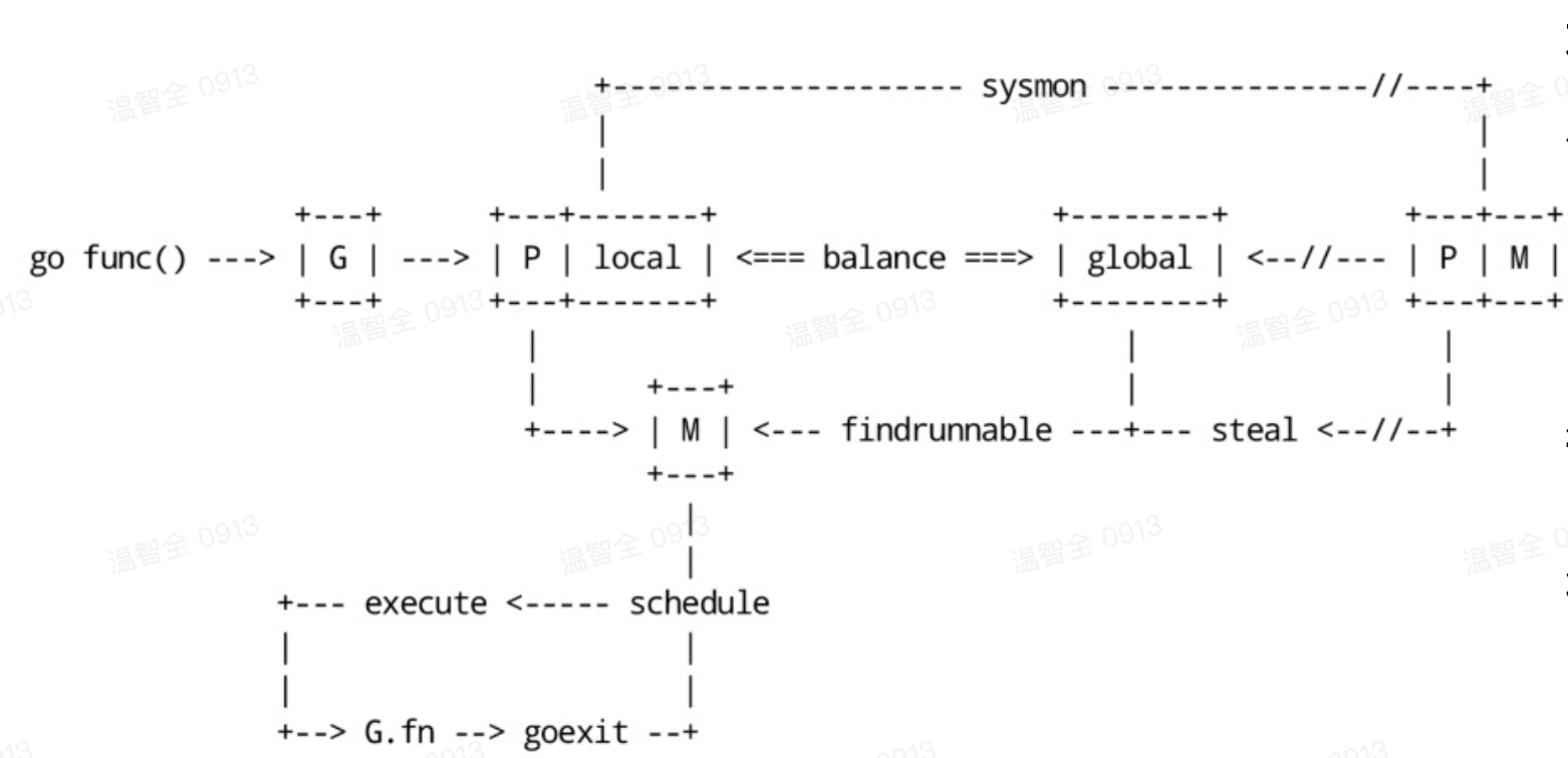 G 为执行代码的基本单元,P 为逻辑 Processor,M 代表一个线程,可以理解为“物理 Processor”,新建的 G 都会优先放入到本地 P 队列中,如果满了会放到 Global 队列中,如果执行完了本队列的所有 G,还会从其他的 P 中 steal 一半的 G 到本地队列中运行以提升性能,其执行流程如下:
