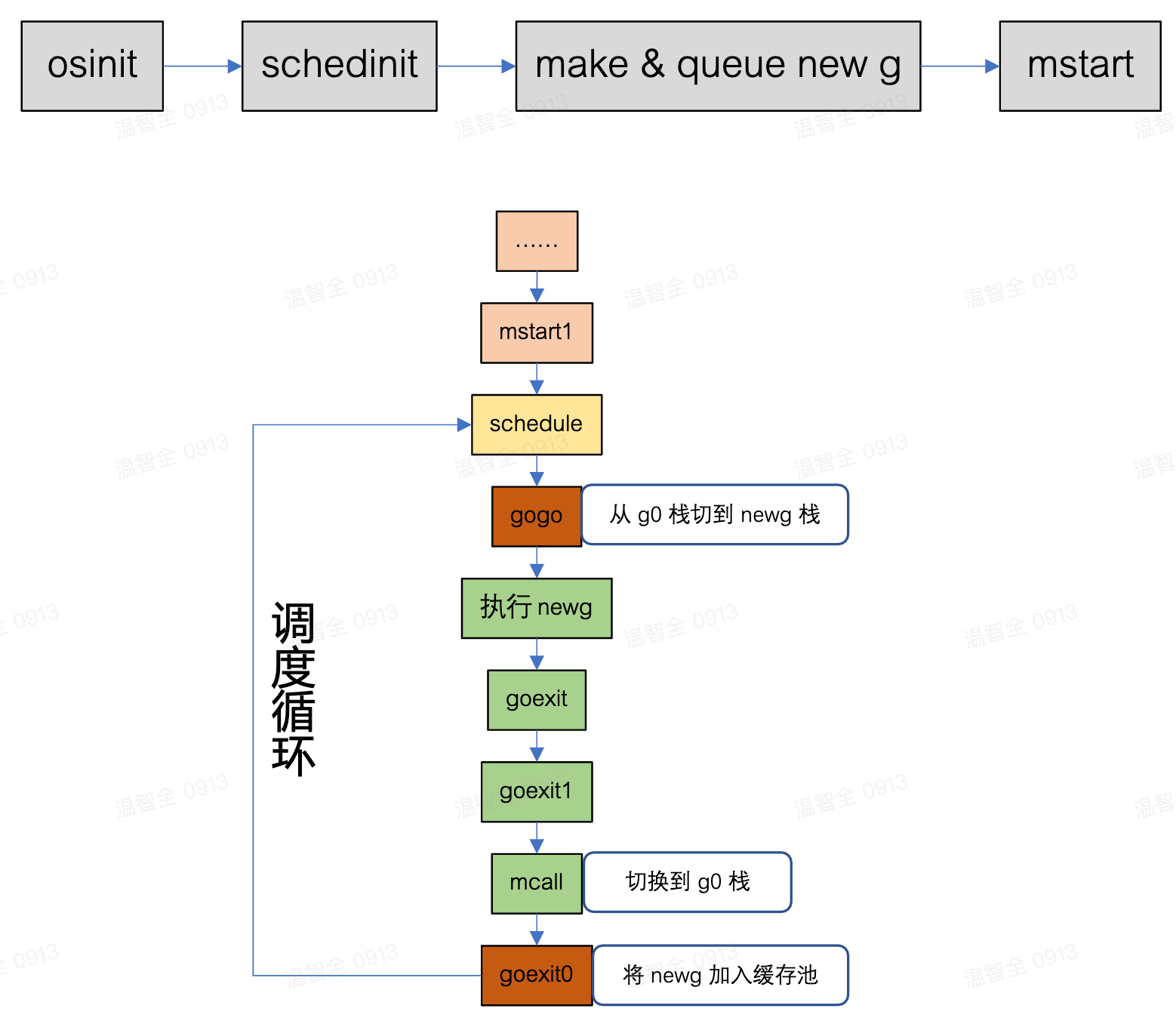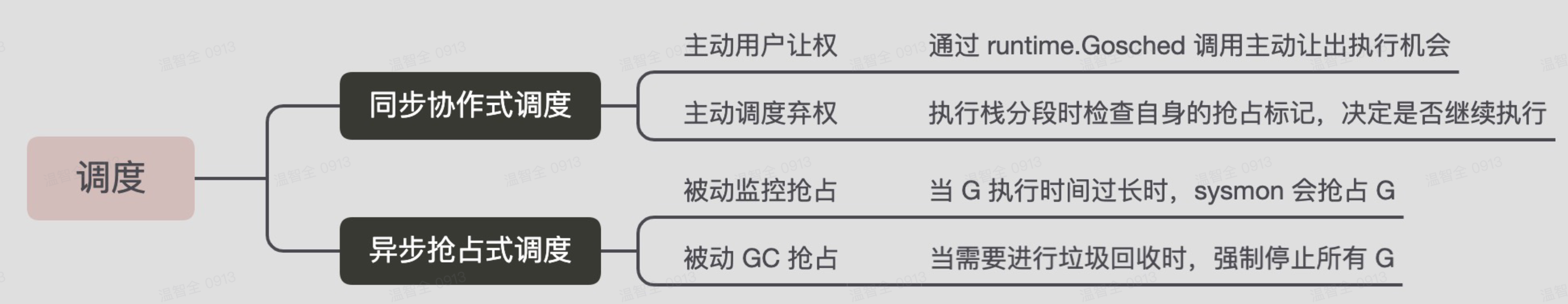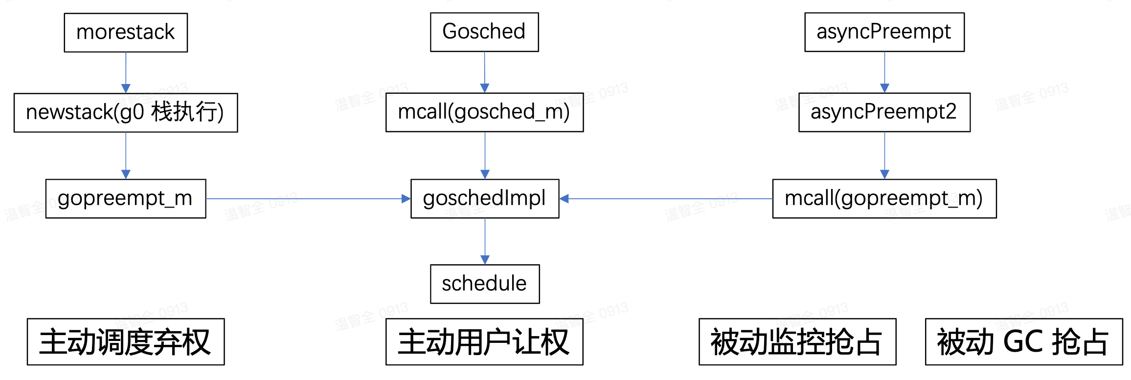 其中需要注意的一点是主动调度弃权必须要有函数调用且有扩栈指令才有机会执行抢占,如果循环中执行的是类似 i++ 这类操作是无法抢占的从而会导致死循环,所以在 Golang 1.14 中实现了基于信号的抢占,其主要流程如下: