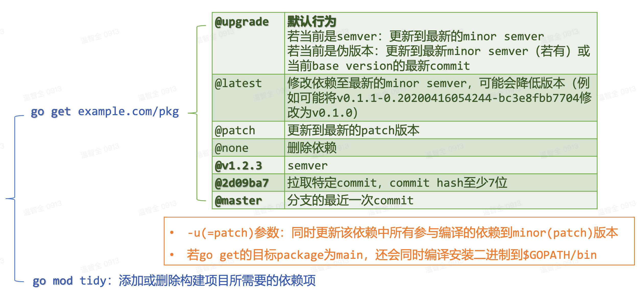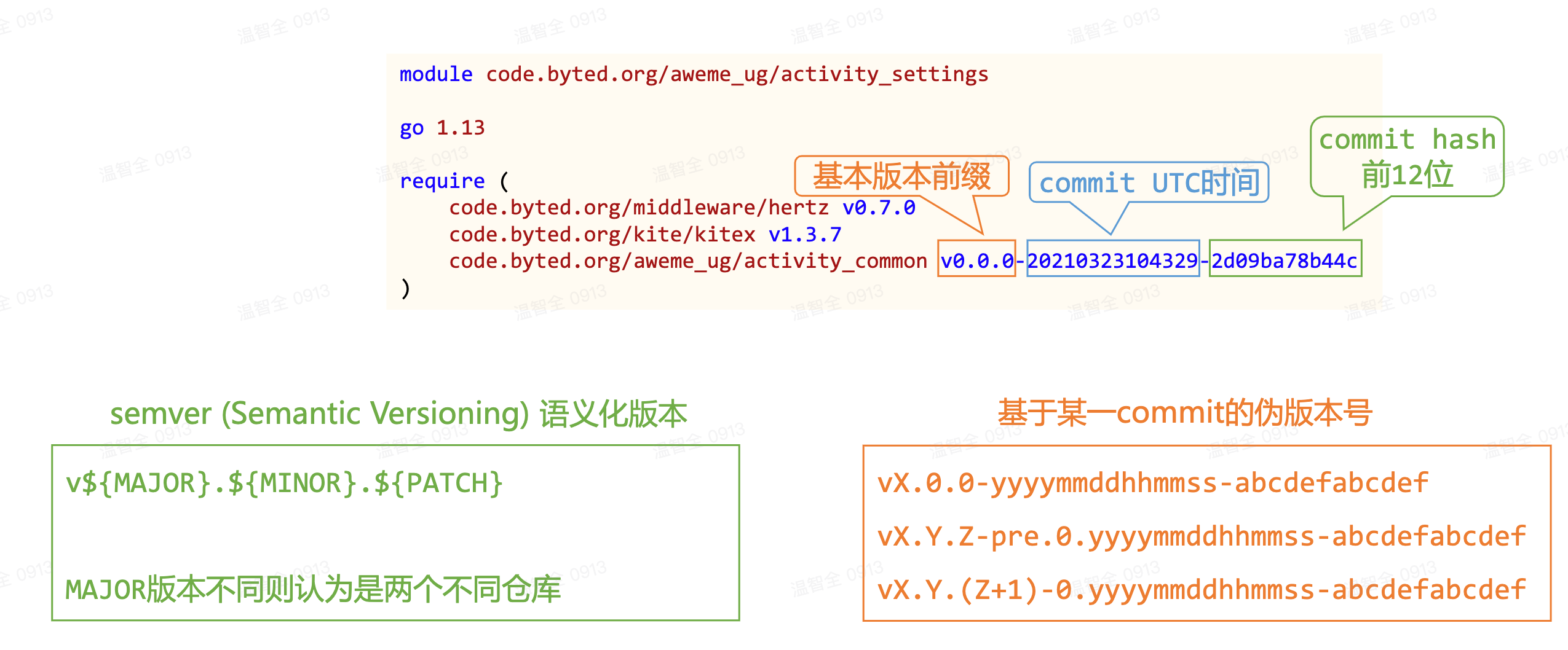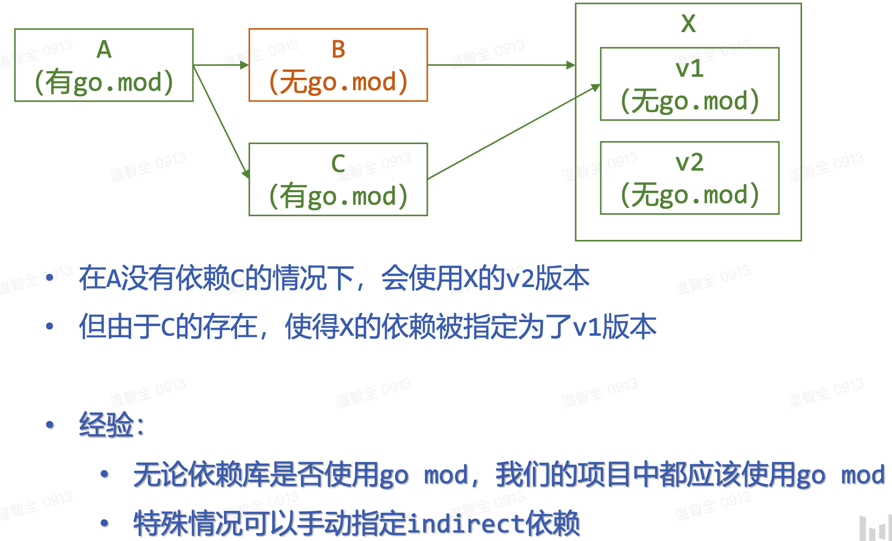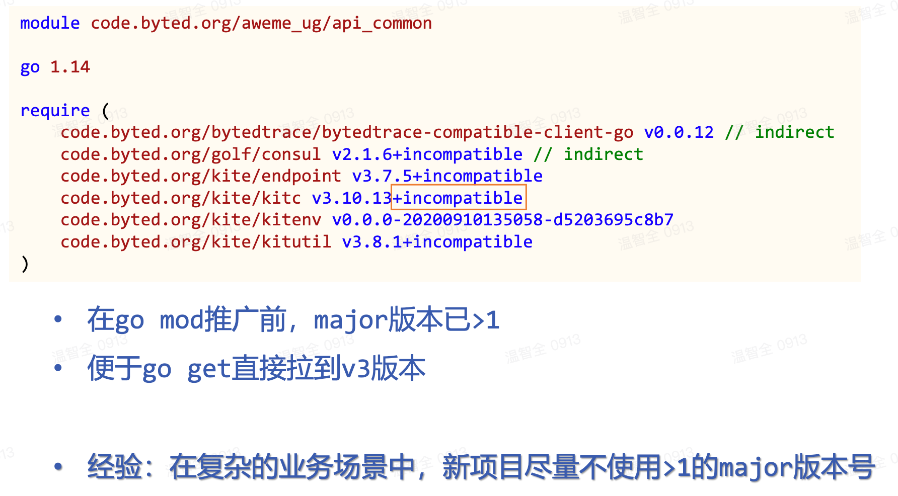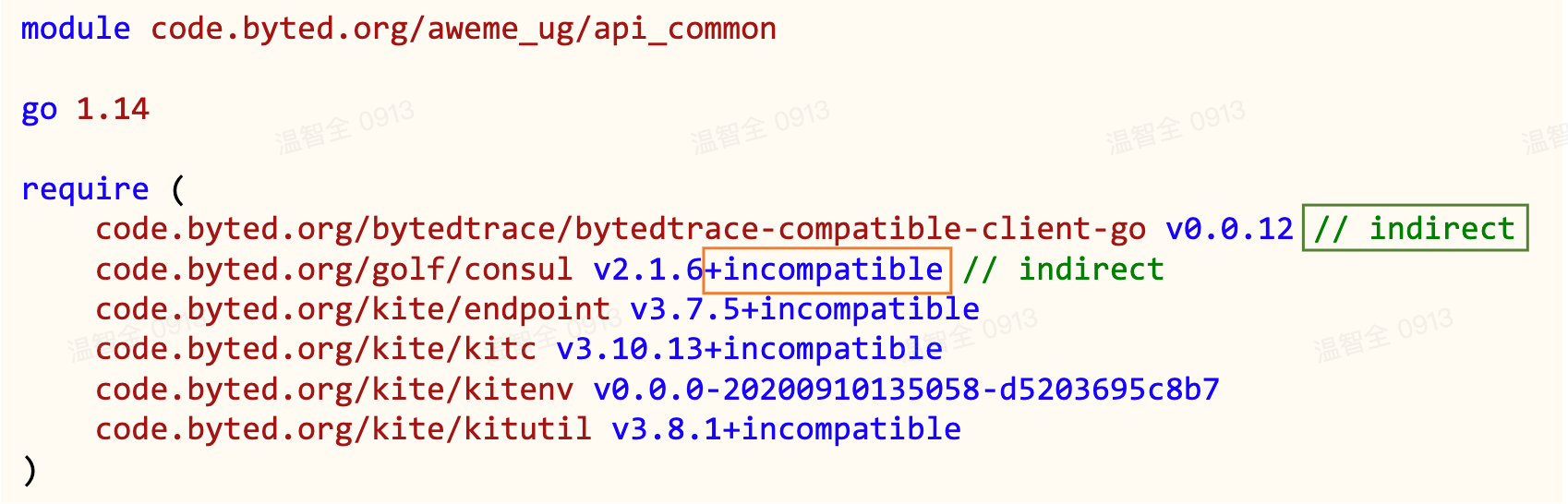实际使用过程中,由于不是所有的库都是使用 go mod 进行版本控制,我们的 go.mod 中可能会有如上图的两个标记: