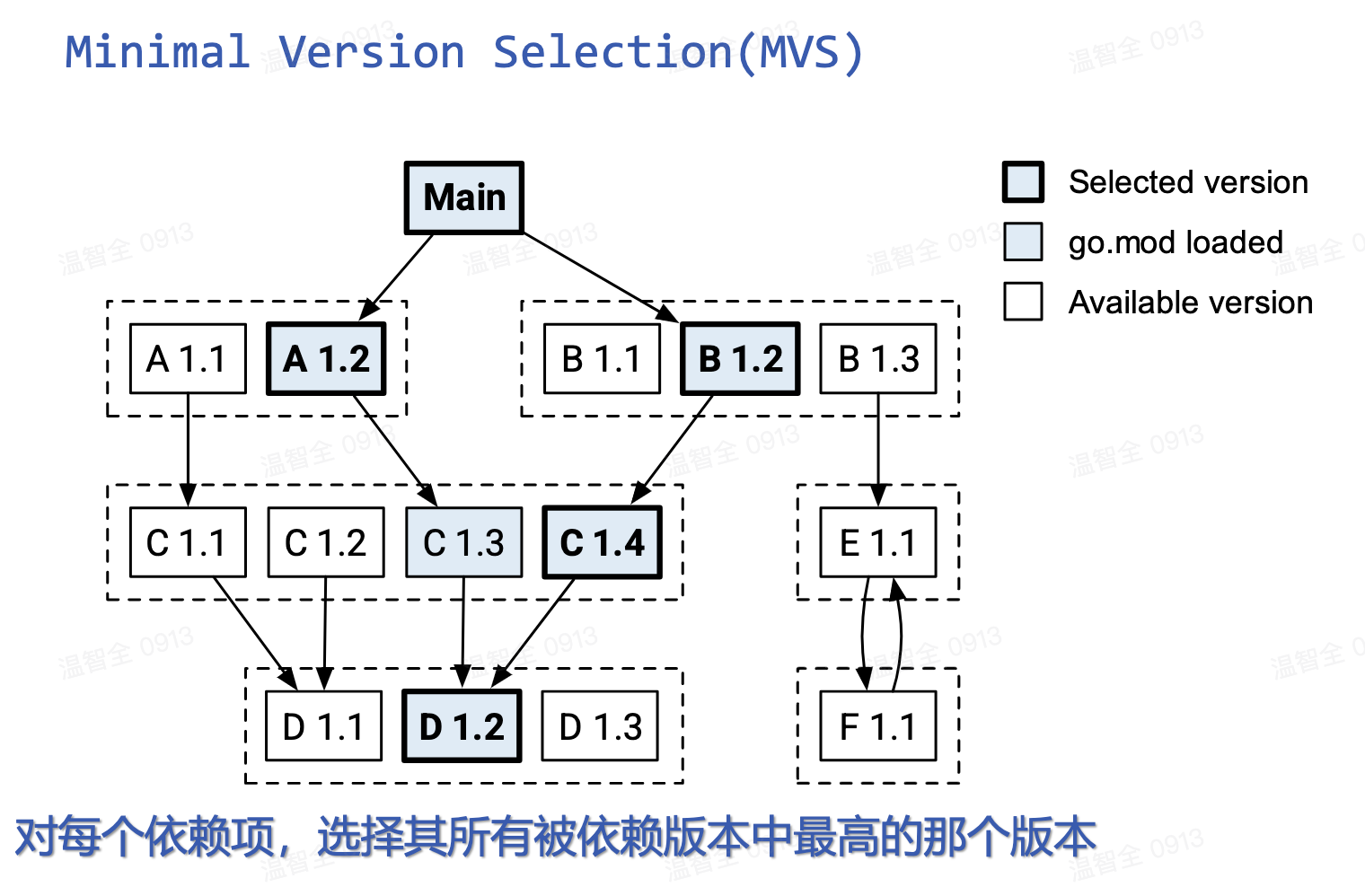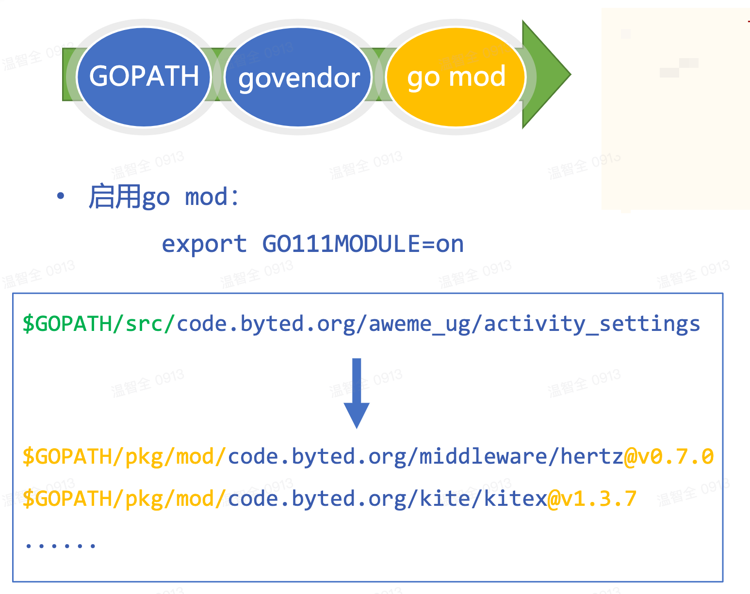 - 所有依赖代码按路径和版本号组织在$GOPATH/pkg/mod 目录下