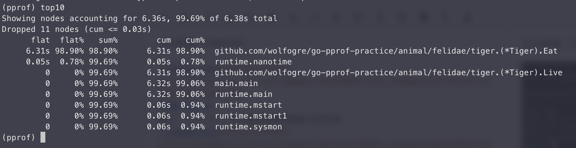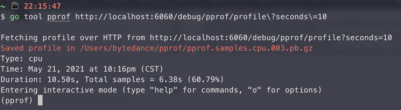 1 | go tool pprof http://localhost:6060/debug/pprof/profile?seconds=10 |