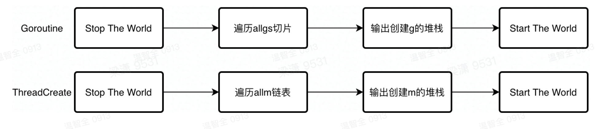 记录所有用户发起且在运行中的 goroutine(即入口非 runtime 开头的)和 runtime.main 的调用栈信息ThreadCreate