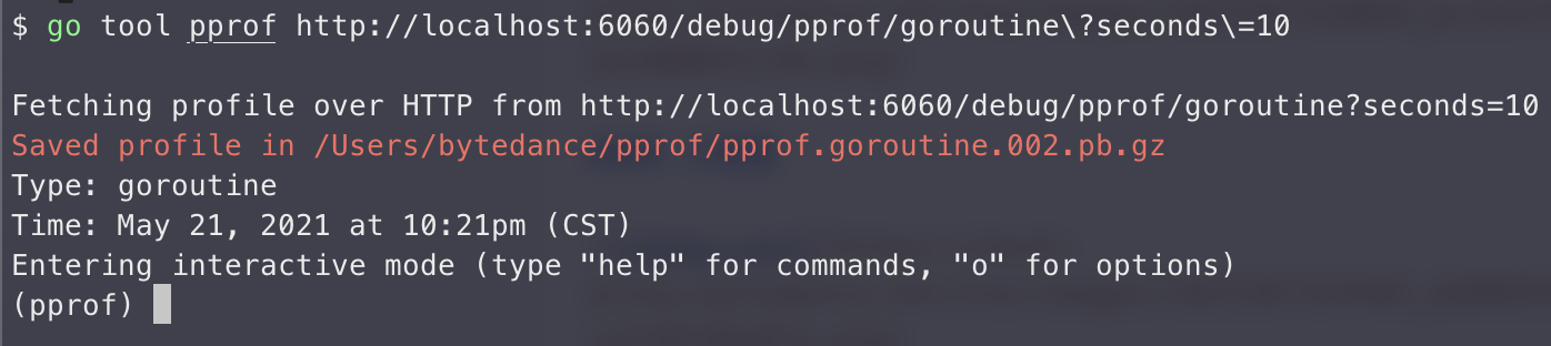 1 | go tool pprof http://localhost:6060/debug/pprof/goroutine?seconds=10 |