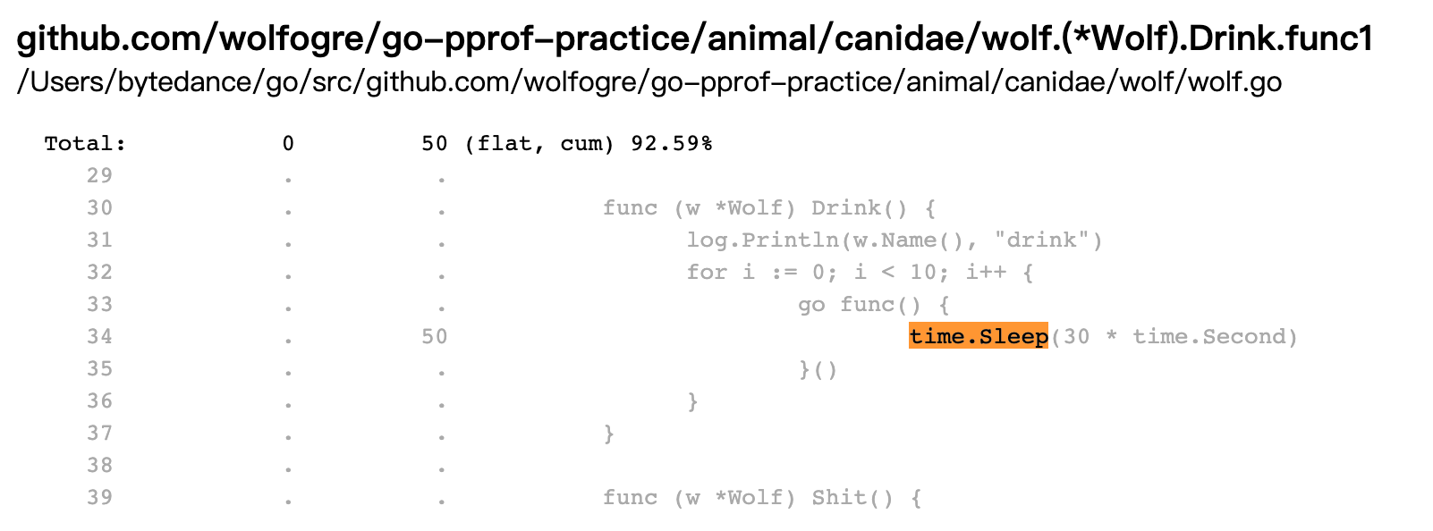 通过火焰图我们可以看出来是 Drink 函数中调用的 time.sleep 占用资源最多,用 source 视图查看: