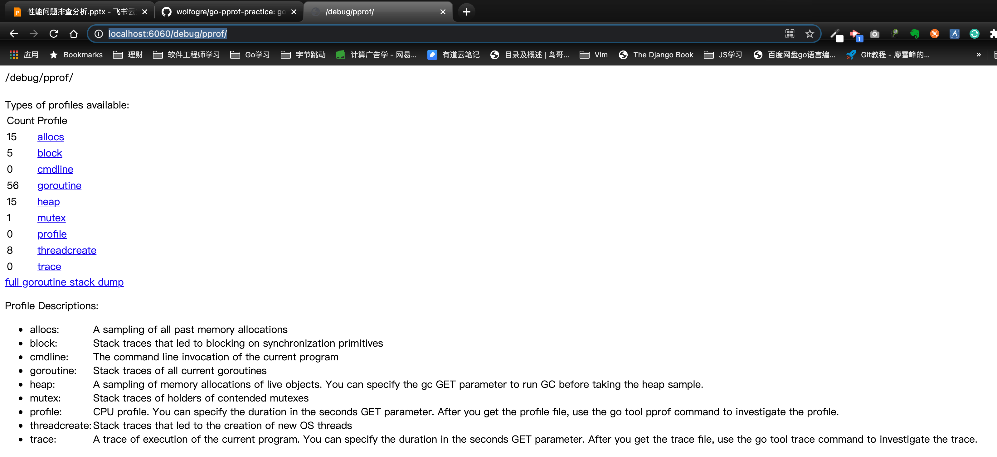 然后我们就可以在浏览器中输入 http://localhost:6060/debug/pprof/ 查看代码运行情况了,效果如下: