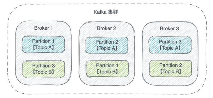 一个 Topic 的多个 Partition 分散在多个 Broker 中,每个 Partition 存放 Topic 的一部分数据。
