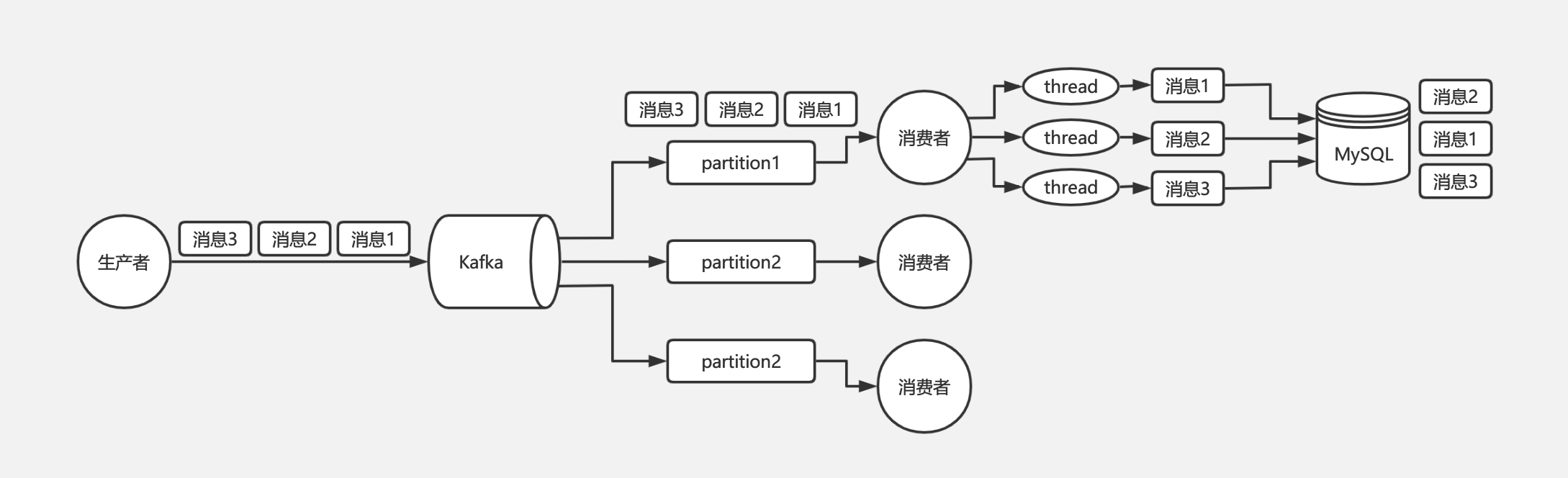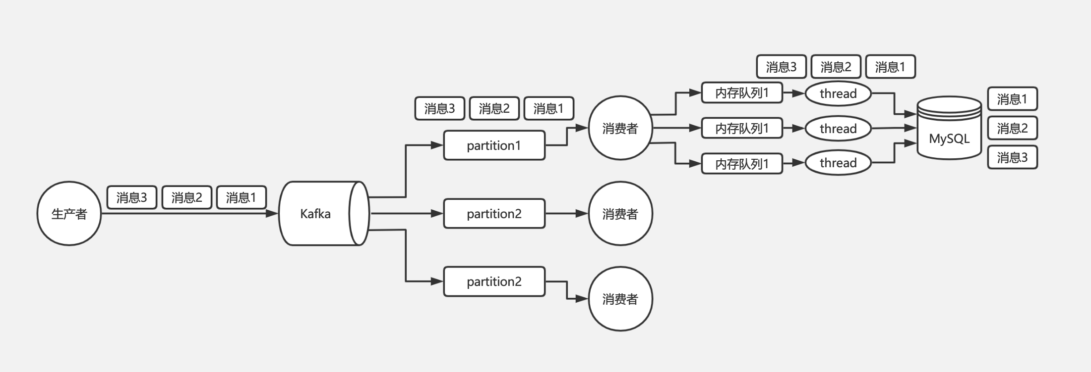 所以对于 Kafka 的消息顺序性保证,其实我们只需要保证同一个订单号的消息只被同一个线程处理的就可以了。由此我们可以在线程处理前增加个内存队列,每个线程只负责处理其中一个内存队列的消息,同一个订单号的消息发送到同一个内存队列中即可。