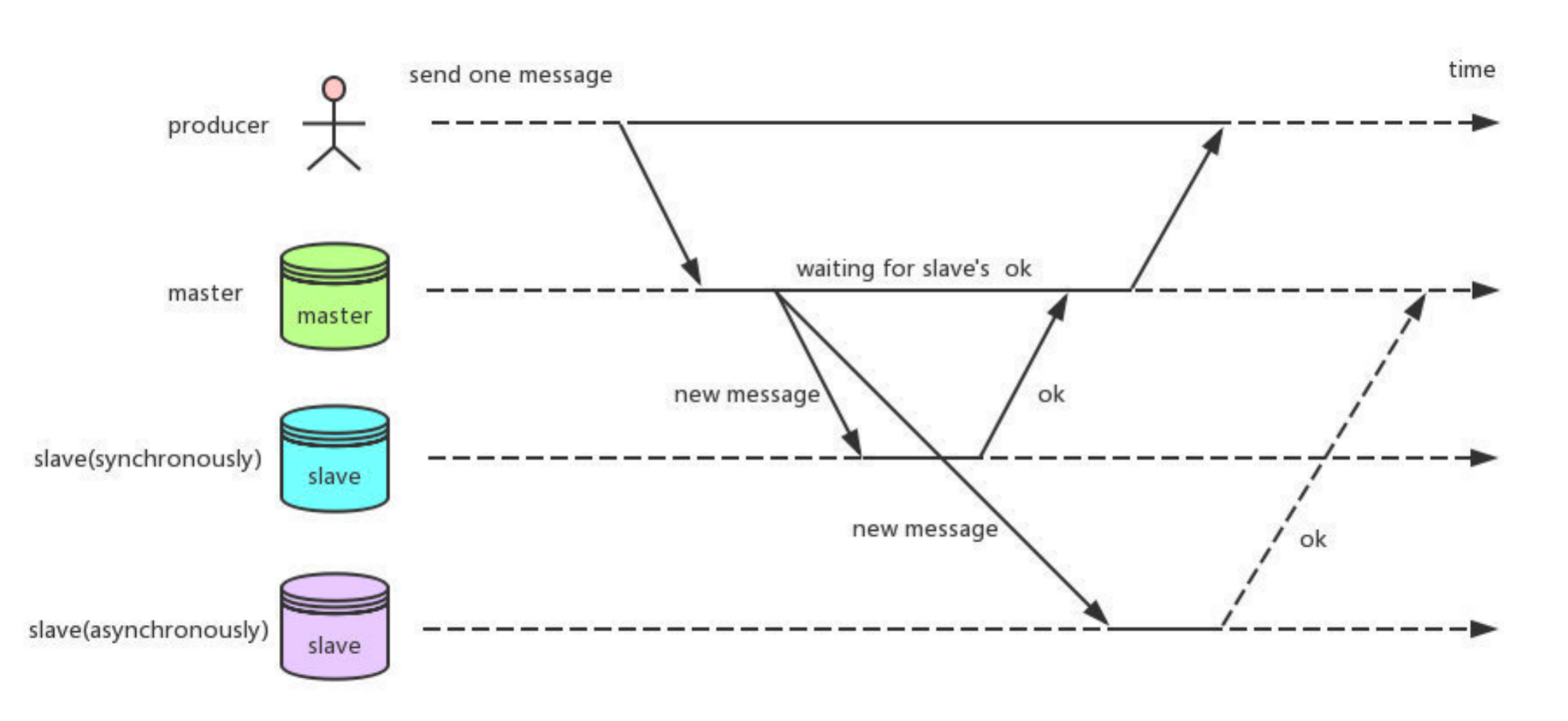 注: 大家不要被上图误导,broker master 只能配置一种复制方式,上图只为解释同步复制的与异步复制的概念。