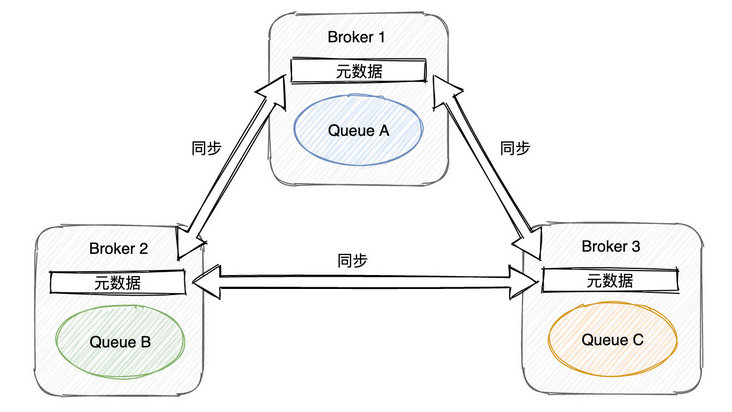 某一个 Queue 是在集群中的某一个 Broker 上,各个 Broker 会同步元数据,但不会同步 Queue 的消息数据。