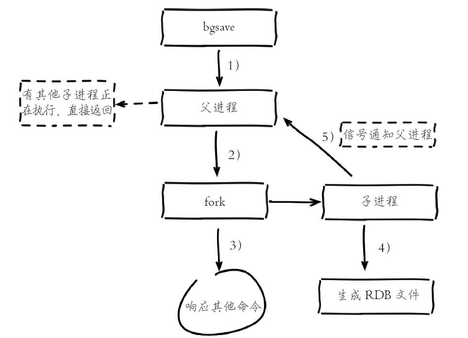 - 执行 bgsave 命令,Redis 父进程判断当前是否存在正在执行的子进程,如 RDB/AOF 子进程,如果存在 bgsave 命令直接返回。