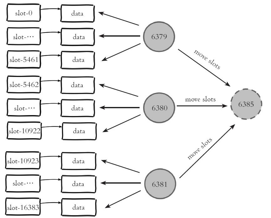 图中每个节点把一部分槽和数据迁移到新的节点 6385,每个节点负责的槽和数据相比之前变少了从而达到了集群扩容的目的。集群的水平伸缩的上层原理:集群伸缩=槽和数据在节点之间的移动。