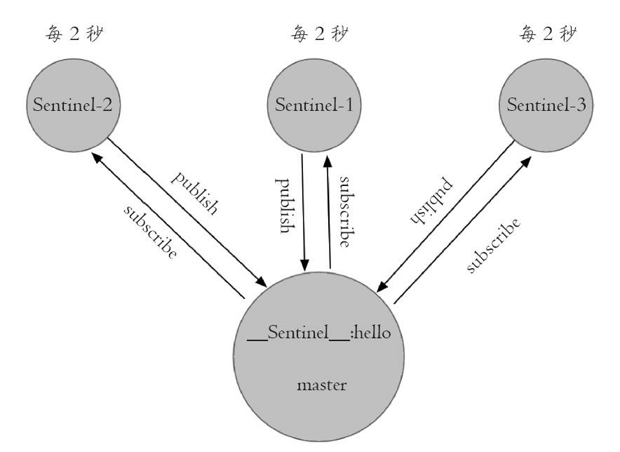 __sentinel__:hello频道上发送该 Sentinel 节点对于主节点的判断以及当前 Sentinel 节点的信息,同时每个 Sentinel 节点也会订阅该频道,来了解其他 Sentinel 节点以及它们对主节点的判断。![]()