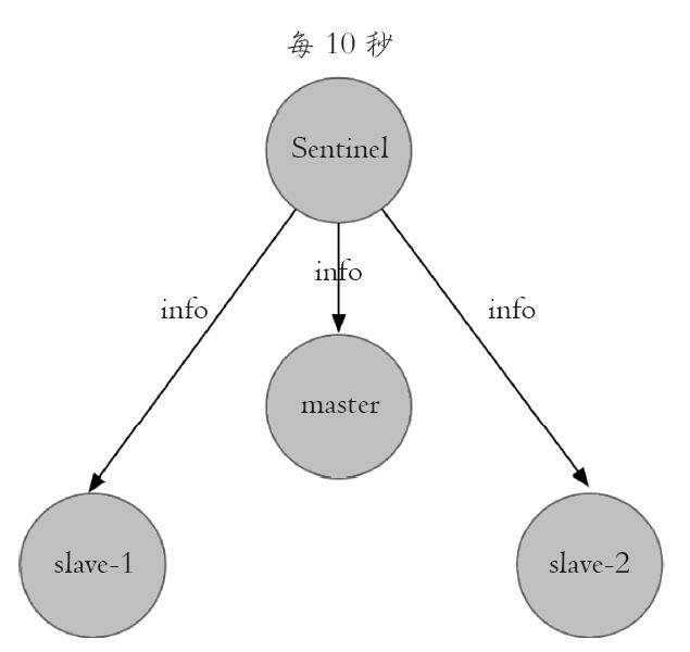 - 通过向主节点执行 info 命令,获取从节点的信息,这也是为什么 Sentinel 节点不需要显式配置监控从节点。