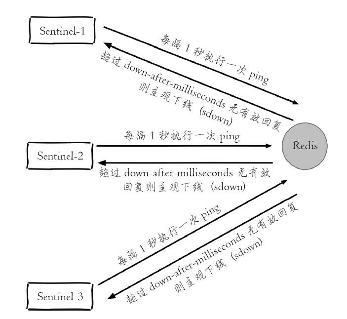 每个 Sentinel 节点会每隔 1 秒对主节点、从节点、其他 Sentinel 节点发送 ping 命令做心跳检测,当这些节点超过 down-after-milliseconds 没有进行有效回复,Sentinel 节点就会对该节点做失败判定,这个行为叫做主观下线。